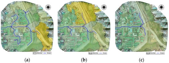 The number of watersheds decreased as the threshold increased. Rainwater converged at three points, two points, and one point when the thresholds were 300, 700, and 1100, respectively. Table 6 lists the number of watersheds based on the threshold value.