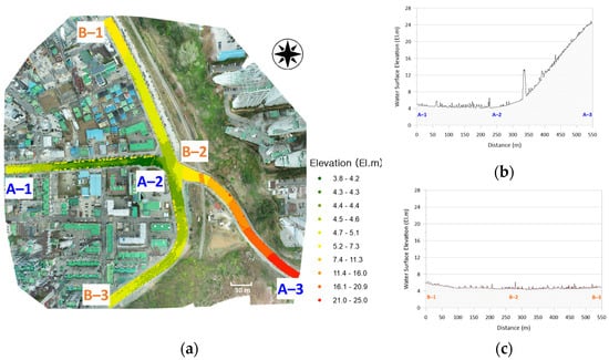 The elevation of the road up to the target point was analyzed for the flow of rainwater flowing into the intersection. The elevation difference was approximately equal to El. 20 m for Road A in the transverse direction, and El. 2.0 m for Road B in the longitudinal direction. Therefore, the flow of rainwater will be introduced to the Samcheok Public Health Center in the transverse direction. Therefore, in this study, an approximately 50 m section of the road in front of the Samcheok Public Health Center, where the flow of rainwater converges with a low-lying area, was selected as a monitoring point in the urban area.