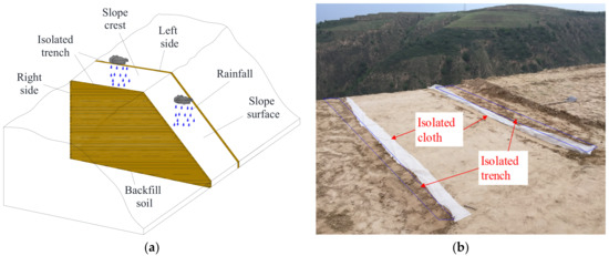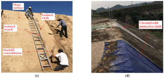 The width of rainfall range is 2.5 m, and the height is 5 m, so the ratio of width to height is 0.5. In addition, polyethylene plastic cloth with characteristics including a dense texture, softness, good ductility, impermeability, and a smooth surface, was selected as the isolated cloth finally. Because the infiltration depth in the rainfall region can reach 3.0 m [17], in order to prevent lateral seepage loss of rainwater from affecting the test results, a trench with a width of 0.1 m and a depth 4 m was excavated at the boundary outside the rainfall area (Figure 3a), laid with isolated cloth (Figure 3b), backfilled and compacted in layers (Figure 3c), and covered for protection (Figure 3d).