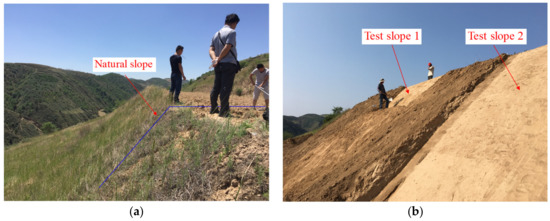 A sloping ground with a height of 5 m was selected as the site in Wugu Town, Wuqi Count. The soil is homogeneous within 5 m below the surface and is brownish-yellow with a large particle size. The viscosity is not strong, composed of silty loess. Before the test, the weeds on the slope surface were cleaned up. Two slopes with a width 3 m and an inclination of 60° were formed. The natural slope is shown in Figure 2a, and the trimmed slope is shown in Figure 2b. Physical and mechanical parameters were measured by undisturbed soil samples, as shown in Table 1.