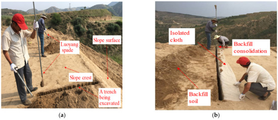 - We backfilled the trench layer by layer and tamped after every 0.2 m of soil thickness to achieve a compactness close to that of the original slope. The slope crest surface of the isolated trench was leveled.