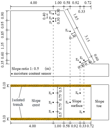 When the isolated trench was backfilled, the soil compaction was higher because of excessive tamps at the right boundary of slope 1, resulting in a compaction effect on the adjacent soil and uneven compactness in the transverse direction, which may have caused a significant reduction in permeability according to the different degree of compaction [27]. Therefore, the rate of rainwater infiltration was reduced, and it took a longer time for rainwater to infiltrate into measuring point E1 in slope 1. Moreover, the greater horizontal pressure led to a increased friction between the isolated cloth and the soil. Under the action of the above factors, a crack in the shape of a round-backed curve occurred and extended from the left boundary to the right edge at the crest of slope 1. This crack mode completely corresponded to the abnormal phenomenon, i.e., that the initial growth time of measuring point E1 was approximately 10 h later than that of measuring point E6 in slope 1. The abnormal phenomenon was caused by the uneven compaction of backfill soil in the isolated trench on both boundaries.