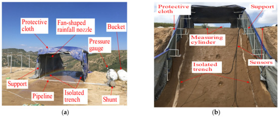 - We selected the natural slope with soil quality and slope that met the test requirements. A trench with a width of 0.1 m on both sides of the boundary close to the rainfall region was vertically excavated downward along the slope crest and surface to the specified depth. The depth of the trench was greater than the maximum local statistic value of the infiltration depth. The trench was maintained upright, and the side wall was flat during excavation. The floating soil at the bottom was finally cleaned up to ensure that it did not influence the effect of the isolated trench.