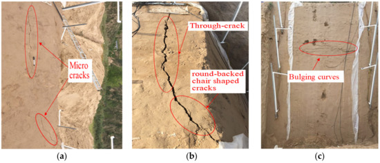 Rainwater infiltration was accompanied by a gradual deformation and displacement under local artificial rainfall. It was mainly manifested in the development of a through-crack parallel to the slope shoulder. The through-crack extended to both sides of the boundary at the slope crest 50–60 cm away from the slope shoulder during heavy rainfall and rainstorm, as shown in Figure 6a,b and Figure 7a,b. The deformation and displacement resulted in a differential settlement and a region of bulging and collapse on the slope surface under heavy rainfall and in rainstorm, as shown in Figure 6c and Figure 7c, respectively.