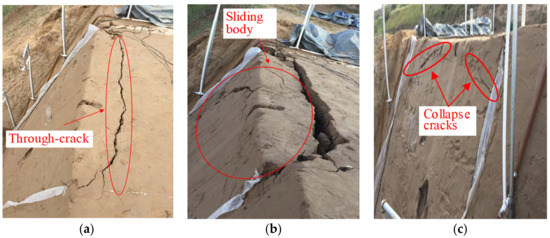 Cracking of the slope under rainstorm: (a) through-crack at the slope crest; (b) sliding body of the slope; (c) collapse cracks at the slope surface.