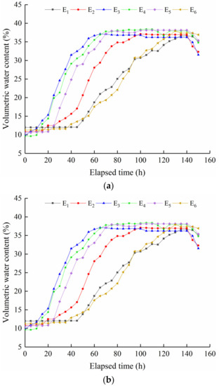 By comparing Figure 8a,b, on the one hand, the average gradient of the change rules is small in slope 1, i.e., the initial growth time of volumetric water content is scattered in slope 1, whereas that of in slope 2 is relatively concentrated. On the other hand, the greater the rainfall intensity, the faster the infiltration rate of rainwater in the silty loess slope. In addition, it can be observed that the initial growth time of E1 is approximately 10 h later than that of E6 in slope 1, whereas in slope 2, the initial growth time of E1 is approximately 5 h earlier than that of E6. This phenomenon is considerably different from the infiltration law in the conventional slope [24] and causes the difference in deformation, as discussed in detail in Section 4.3.