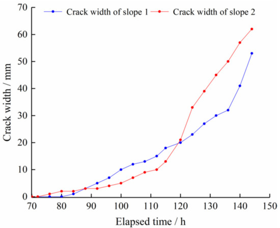 Based on the data of cracking width measured during rainfall, the curves of crack width with time at the crest of slope 1 and slope 2 are shown in Figure 9. The crack width increased with local artificial rainfall, which is shown as a pattern of alternating growth. At the initial stage of cracking, the rainwater and depth of infiltration were limited [25], resulting in the slow growth of the crack width. However, the rapidly increase in rainwater infiltration depth at the later stage resulted in a substantial increase in the weight of the soil, thus accelerating crack expansion. In addition, at the later stage of rainfall, the growth of crack width was considerably facilitated by the scouring of large-scale runoff caused by the rainstorm [26].