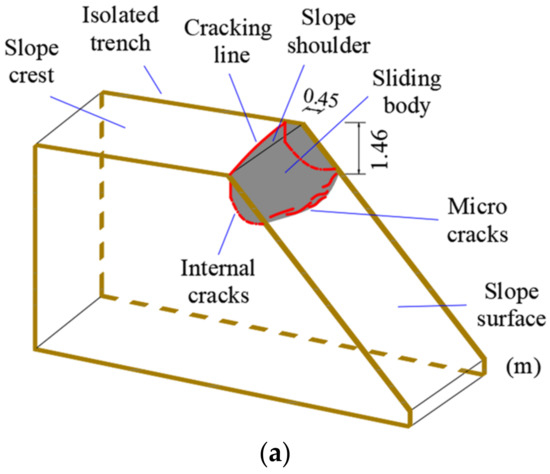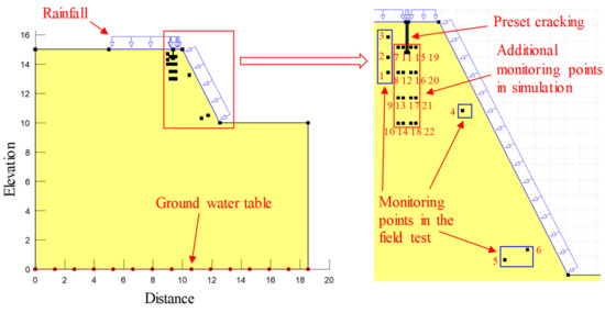 The most significant feature of test slope 2 was the formation of a through-crack on the slope crest. Therefore, features of cracks must be fully considered in analysis of numerical simulations, particularly for cracks with the same characteristics as those in the field test, such as crack position, depth, and parameters of infiltration [32]. Consideration of these features enables an accurate analysis in the numerical model.