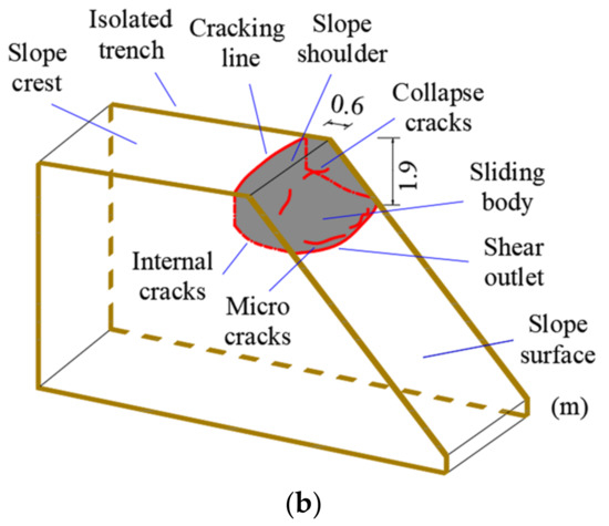 In the third stage, crack propagation and slope bulging occurred. At the initial stage of crack formation, only a small amount of rainwater infiltrated into the crack. Part of the remaining rainwater continued to infiltrate, whereas the other part was discharged by surface runoff, which caused serious scouring on the slope surface. With an increase in water infiltration depth, the soil along the crack surface was destroyed gradually, whereas the tensile strength of deep loess was greatly reduced. The structure composed of soil particles near the crack surface was also destroyed by soaking because the area near the crack was always saturated, and the cementation between soil particles was reduced. These behaviors resulted in a significant reduction in soil cohesion. In addition, the cracks gradually evolved into seepage channels of rainwater as the vertical cracks extended [21]. The pressure between the top and the bottom of the crack, difference, and the erosion of water on the side wall facilitated the crack expansion [22]. A structural plane was ultimately formed inside the slope. Thus, an independent soil column was formed by the front edge of the crack. Under the influence of factors such as seepage pressure and collapsibility of soil, the independent soil column had obvious settlement deformation, and the front and rear edges of cracks formed a downward-cutting displacement. Moreover, multiple bulging cracks appeared on the slope surface, and a bulging zone was formed between the shear outlet and the slope shoulder.
