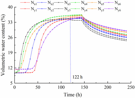 Figure 12 displays the change curves of volumetric water content, including the monitoring points of Nn1–Nn6 in NMOD and Ny1–Ny6 in NMODC. We observed that the volumetric water content in the two numerical models was different, as the crack was set at 122 h of simulated rainfall.
