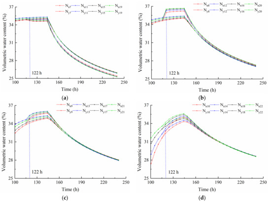In addition, the 16 numerical monitoring points in NMOD and in NMODC were distributed in the four layers. They were divided into upper, middle, lower, and bottom monitoring points. The change curves of volumetric water content from 100 h after the beginning of simulated rainfall are shown in Figure 13a–d.