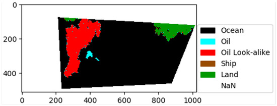 Incorrect labeling (Oil Spill) around edges in the outlines of the Oil Look-Alike area. Bi-linear default interpolation—mistaken label interpolation caused after augmentation.