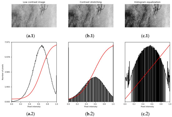 Filter comparison: (a.1) original image; (b.1) image with contrast stretching; (c.1) image with histogram equalization. the second row contains image histograms (black) and the cumulative distribution function (red) of each case: (a.2) original image; (b.2) image with contrast stretching; (c.2) image with histogram equalization. As can be seen, each filter affects the image histogram distribution differently.