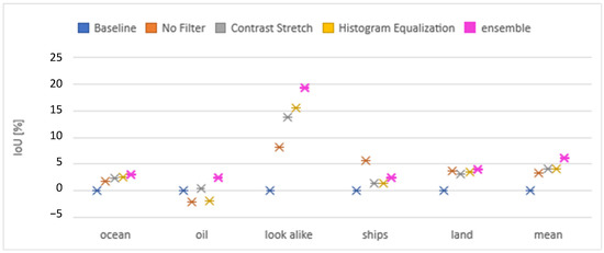 The Ocean class showed an improvement in the IoU score for both filters when applied to either model. The highest score was 96.43% for the Unet model using the histogram equalization filter, which is equal to the score performed by the DeepLabv3+ model in the baseline research. The Oil Spill class, which is our most challenging and significant class, showed an improvement in its detection for both the contrast stretch filter and histogram equalization filters compared to the models without a filter. Using the contrast stretch filter, the models showed an improvement compared to their baseline: a ~1% increase for the Unet architecture and a 2% increase for the DeepLabv3+ architecture. The highest IoU score of 54.5% was achieved by the DeepLabv3+ model with the contrast stretch filter. The Oil Look-Alike class also showed an improvement for both filters compared to no filter. The histogram equalization filter achieved the best results for Oil Look-Alike, showing an increase of ~40% for the Unet architecture and ~4% for the DeepLabv3+ architecture. Regarding the effects of the filters on the Ship and Land classes, there was no conclusive change that could be inferred.
