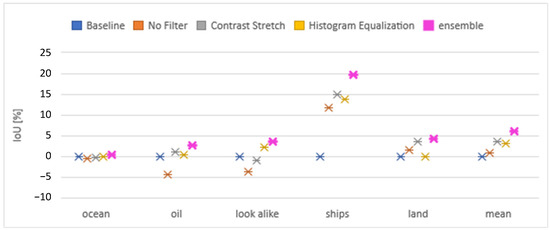 Regardless of the architecture chosen, the histogram equalization and contrast stretching filters helped in the detection of the Ocean, Oil Spill, and Oil Look-Alike classes but showed nothing conclusive for Land and Ship classes. Most previous studies in this field did not attempt methods to highlight the textures and outline of the images’ elements, i.e., [10,13]. The authors of [14] examined the effect of tested threshold segmentation techniques on the results, which resulted in the loss of information from the original images. The image pre-processing techniques used in this study were able to highlight the differences between elements without losing significant information from the images. This indicates that emphasizing the disparities between the elements of the images, without causing much loss of information, assists in the detection of marine oil spills.