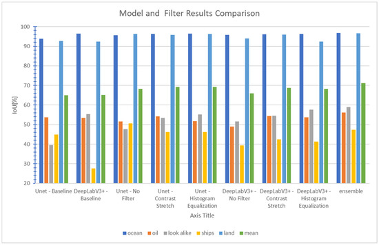 As shown in Figure 5 and Figure 6, applying the histogram equalization filter along with the contrast stretch filter improves the overall performance of both the Unet architecture and the DeepLabv3+ architecture when compared to the baseline results. The results in Table 2 below further imply that filters improve the performance on the Ocean, Oil Spill, and Oil Look-Alike classes, but have a mixed effect on the Ship and Land classes. Averaging the output of the given models for each class, which is presented as the ensemble model, shows further improvement in the results for all classes, except the Ship class.
