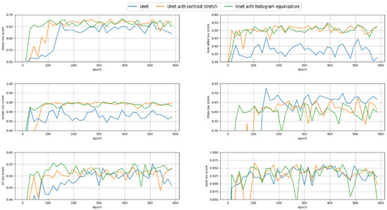 As shown in Figure 8 and Figure 9, throughout the training, the Ocean and Oil Look-Alike scores were higher when filters were applied, as compared to no filters. This effect can also be seen for the Oil Spill class, although it is more obvious for DeepLabv3+ than for Unet. This reinforces further the results seen in Table 2, which showed a clear improvement when using both filters. Both Unet and DeepLabv3+ regularly reached an IoU score of 0.55 for the Oil Spill class when we applied the histogram equalization filter. However, in the best-performing model, the IoU score of this class was slightly less for both architectures. This indicates that although the results in Table 2 showed better performance for the contrast stretch filter in detecting Oil Spill pixels, both filters are equally beneficial in this regard.