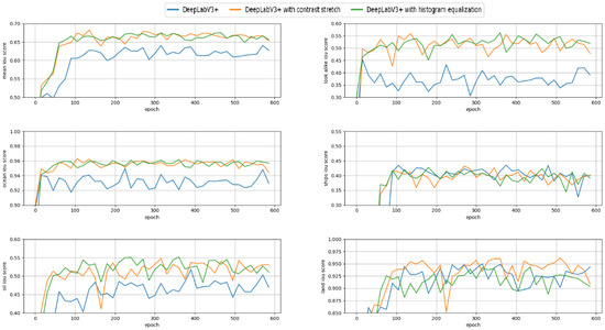 Test set IoU scores of the models utilizing the DeepLabv3+ architecture, measured every 25 epochs.