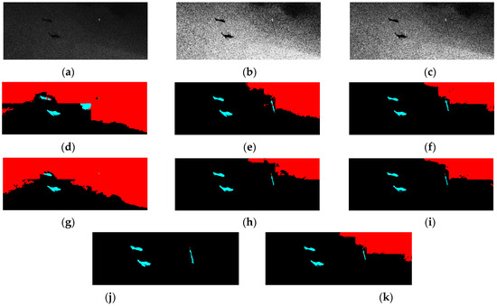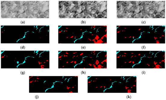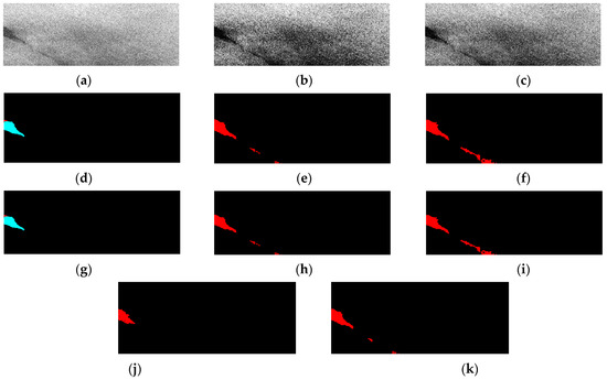 Example 2 of the different predictions created by the models: (a) original image; (b) image with histogram equalization; (c) image with contrast stretch; (d) DeepLabv3+ prediction; (e) DeepLabv3+ with histogram equalization prediction; (f) DeepLabv3+ with contrast stretch prediction; (g) Unet prediction; (h) Unet with histogram equalization prediction; (i) Unet with contrast stretch prediction; (j) ground truth; (k) ensemble model prediction.
