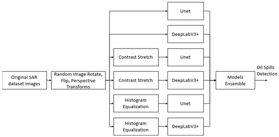 Our goal was to create a systematic sequence of methods, including the use of CNN architectures for the semantic segmentation step, and use several classic image processing methods adjusted for each label’s most accurate detection, all combined with an ensemble model and applied to the dataset. Specifically, the application of image filters to the dataset was examined, such as histogram equalization and contrast stretching, alongside the implementation of augmentations on the training dataset. These methods were implemented to determine the most beneficial solutions compared to existing detection methods, and their effectiveness was measured. Using this combination of selected techniques resulted in a decrease in the oil spill vs. look-alike false detection rate while increasing the mean score by 9.3% in terms of the intersection over union (IoU), compared to the current state-of-the-art approaches [10].