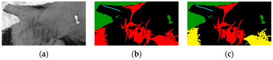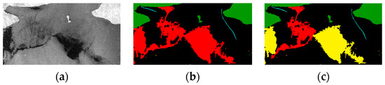 (a) Satellite image; (b) single ‘Oil Look-Alike’ type (red); (c) two ‘Oil Look-Alike’ types (red as Sharp and yellow as Patch Look-Alike).