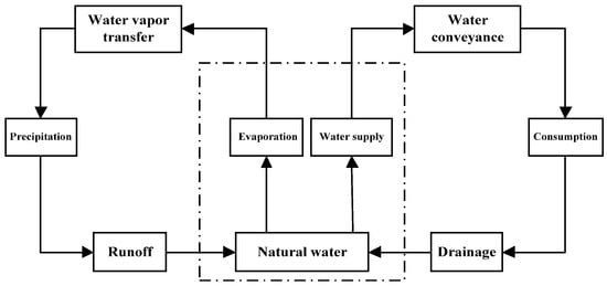 Modern human activities cause interactions between both social and natural systems, which are often linked by water. Human development and natural water utilization have altered the original natural water balance system, leading to the emergence of the social water circulation system. The social water cycle is a natural water cycle mixed with human activities, which has a profound impact on natural water circulation. Therefore, human activities are the main driving factors of the social water cycle. The social water cycle is defined as the “artificial collateral water cycle” within the natural water cycle, and includes four basic links: water supply, water distribution, water utilization, and water drainage []. The theoretical framework of the social water cycle provides an effective tool for rational utilization and management of water resources. The study of the social water cycle is an interdisciplinary subject, characterized by many influencing factors, complex mechanisms, and prominent regional characteristics, encompassing the process, structure, flux, and regulation of the social water cycle []. This article mainly focuses on the water cycle path under the framework of the social water cycle. It should be noted that for different industries, the micro water cycle process in the industry has its own characteristics, and when it is applied to specific industries, we should continue to make meticulous divisions and classifications under this framework, such as industrial water use and collection [,]. The diagram of the social water cycle system is shown in Figure 2.