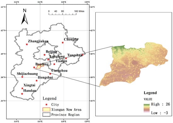 Xiong’an New Area is located in Beijing, Tianjin, Baoding hinterland. The geographical coordinates of Xiong’an New Area are 38°43′ N–39°10′ N, 115°38′ E–116°20′ E, and its area is approximately 1770 square kilometers. The territory and its surrounding areas are located within the plains area east of Taihang Mountain, with a gradually reduced slope from the northwest to the southeast. The ground elevation is consistently between 5 to 26 m, and the ground slope is less than 2‰. The area is characterized by a warm temperate monsoon continental semi-humid and semi-arid climate. According to the meteorological data of Rongcheng county from 1968 to 2016, the mean annual temperature was reported as 12.4 °C, the extreme maximum temperature was 41.2 °C, the extreme minimum temperature was −22.2 °C, the annual sunshine was 2298.4 h, and the average annual frost-free period was 204 d. Additionally, the average annual precipitation is 495.1 mm, the extreme maximum annual precipitation is 931.8 mm, and the extreme minimum rainfall is 207.3 mm. The average evaporation over many years was 1661.1 mm. The overview of the study area is shown in Figure 5.