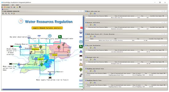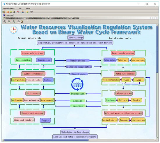 Under the influences of global environmental change, the water cycle exhibits a characteristic “natural-social” duality. The theoretical framework of this dualistic water cycle model has become relatively mature and the frameworks for the natural and social water cycles of the process description are now relatively clear. Although many studies in this field focus on further improvement of the model, it is difficult to apply it to the multi-scenario regulation of water resources. To address this gap, based on the comprehensive integrated platform, this paper uses visual knowledge map technology and component technology to visualize the theoretical framework of the dualistic water cycle, and establishes a framework system for the visualization of the dualistic water cycle process. Three different water resource regulation scenarios were established in the system and example applications of water resources regulation using the system were realized. The simulation results of the system show that the system intends to assist the business function of water resources regulation, and it is able to set up a number of dynamic scenarios that can be controlled by users and assist the application of regional water resources regulation. The system’s regulatory process is visual, trustworthy, and operational, and it realizes the simulation application of water resources regulation under the framework of the dualistic water cycle.
