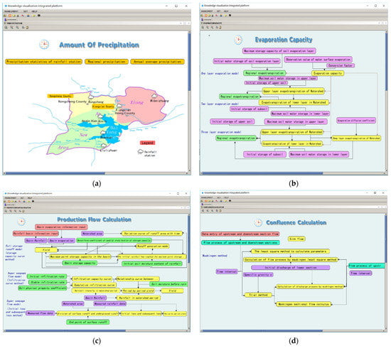 In the application process, depending on the study area, we can select different components by editing the knowledge graph, such as the A region using the arithmetic mean method to calculate the average precipitation of the area surface, and the B region using the Thiessen polygon method []. This allows us to quickly calculate the results of the system. The data calculated by each icon and node can be transmitted through the linear elements on the knowledge graph, and the dynamic and rapidly adjusted properties of the system are reflected.