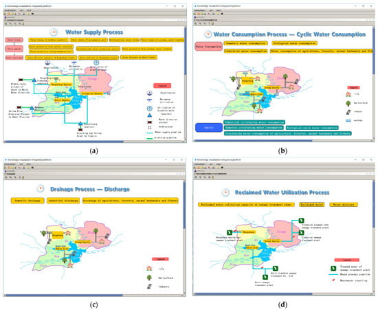 Visual description of the social water cycle. (a) Water supply process interface. (b) Water consumption process interface. (c) Drainage process interface. (d) Reclaimed water utilization process interface.