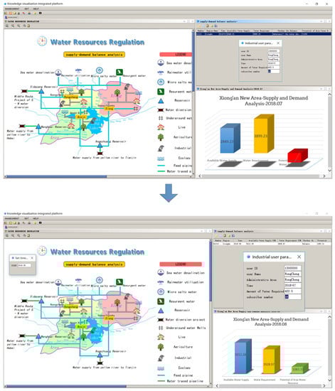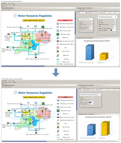 With increased economic development and the intensification of human activities, when a user’s water demand increases, there will be a scenario where there is a water supply available to meet the increase in water demand. In the knowledge map of water resources regulation, it is assumed that the water demand of industrial water users in Rongcheng county increases. Business personnel can click on the Rongcheng Industrial “Water User” icon to adjust this setting. In the pop-up Rongcheng industrial user adjustment interface, the business personnel manually enter the water demand of Rongcheng Industrial users, and when the “OK” button is clicked, the system will automatically perform a supply and demand balance analysis, and the results of the supply and demand balance calculation will update accordingly. If the water demand of the industrial users of Rongcheng is adjusted to make the water supply and demand balance calculation unbalanced, we can choose the water supply for the industrial users of Rongcheng, and adjust the water supply of the water source in the same way until the results of the water supply and demand balance calculation indicate that balance has been achieved. The dynamic regulation process of water resources in this scenario is shown in Figure 10.