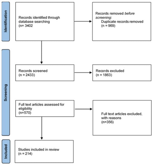 A total of 3402 papers were retrieved from Scopus and Web of Science by using the search terms identified (Table 1). After applying the inclusion and exclusion criteria (Figure 1), a total of 214 papers were included for review, and they are presented in Table S1.