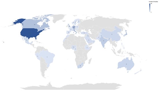Map displaying the global distribution of all studies reporting the presence of one or more opportunistic premise plumbing pathogens in residential properties. Number of studies conducted in each country is indicated by colour intensity. Colour intensity increases as the number of studies increases.