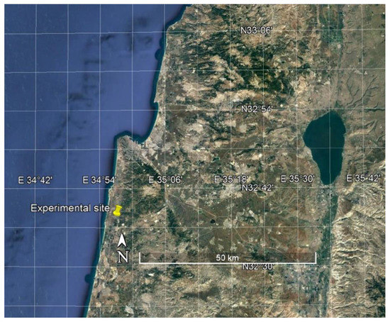 A map of northern Israel indicating the location of the experimental site (the yellow pin) on the Mediterranean coastal plain (source: Google Earth; retrieved on 22 March 2022).