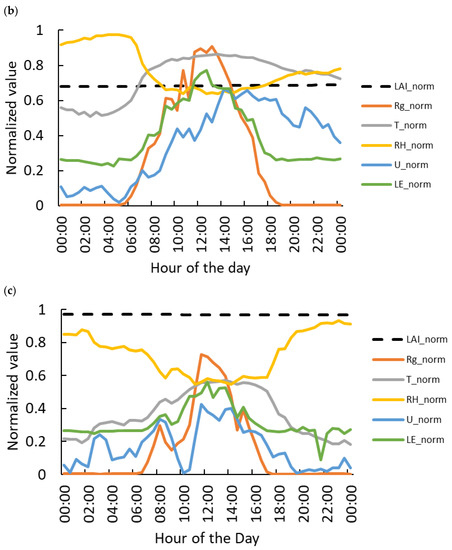 Diurnal courses of the main variables during a typical day (a) 27 June; (b) 14 August; and (c) 4 November 2017. The variables were normalized to the range 0–1, using each variable’s minimum and maximum value throughout the 2017 season. LAI—Dashed black; Rg—orange; T—grey; RH—yellow; U—light blue; LE—green.