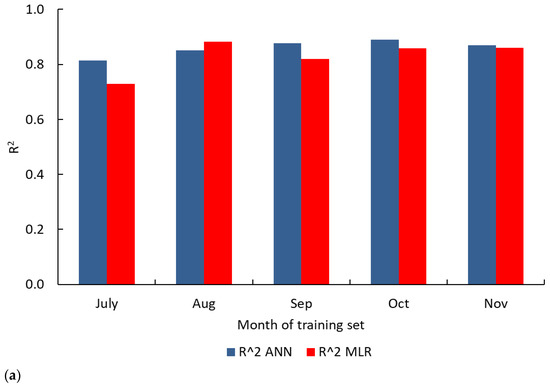 Figure 3a,b present the results of the analysis where data of one month was used for training and the rest of the data used for validation. The figure shows that except when trained using August data, ANN performed better than MLR giving lower RMSE and MAE, and higher R2 than MLR.