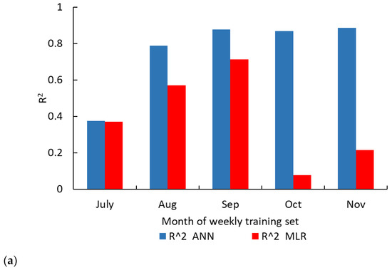 Analysis was also performed using a one-week training period. The results in Figure 4 showed that when the one-week training period used September, October, and November data, the ANN model’s performance (R2) was higher than during July and August. Again, this can be explained by the diverse weather during the autumn months (September, October and November) compared to the uniform weather during the summer months of July and August. Regarding the MLR model, R2 with training during a week in October and November was lower than during July, August, and September. Similar to the results for one-month training, this result of the MLR model is opposite to that obtained with the ANN model and deserves further research.