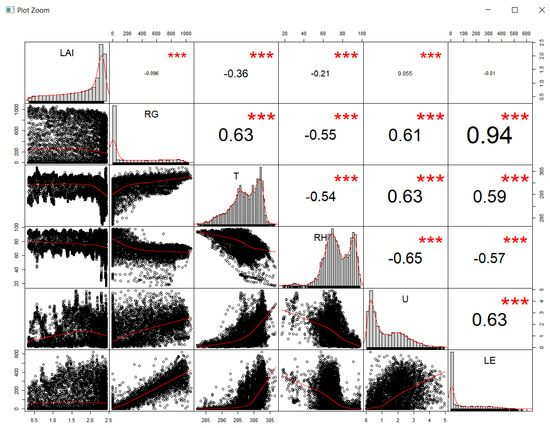 The matrix in Figure 5 shows the correlations between the half-hourly time series of the input variables and the target. Of primary interest is the correlation between the dependent variable LE (the target) and independent variables. It is seen in the figure that solar radiation is mainly correlated with LE (0.94). In contrast, wind speed, air temperature, and air relative humidity, have a significantly lower correlation with LE (0.63, 0.59, and −0.57, respectively). The leaf area index (LAI) has the lowest correlation with LE. A stepwise analysis (using the function Step of the R package) considering the four meteorological variables provided similar results: the solar radiation was the most influencing variable, then the wind speed, and finally the air temperature and relative humidity.