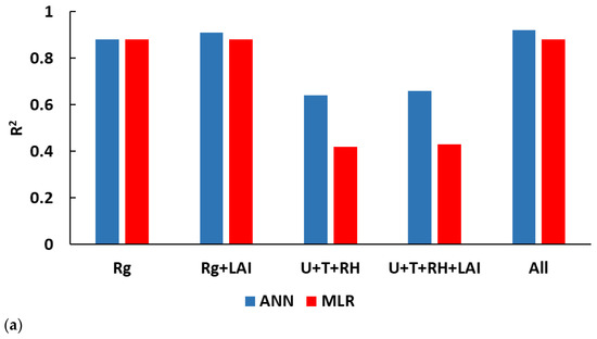 The results in Figure 6a,b show that the inclusion of LAI as input made only a slight improvement to the statistical measures, except for the MLR model where RMSE and MAE with Rg + LAI was higher than for Rg alone (Figure 6b). For the ANN model, the results also show that using Rg alone as input provided R2, RMSE and MAE that are not much worse than using all input variables. On the other hand, using only U, T and RH, as input variables reduced model performance. With the MLR model, using Rg alone only slightly decreased R2; however, RMSE and MAE were significantly larger than a model based on all input variables. A similar analysis was done, estimating , which compensates for a different number of data points in each regression (results not presented). Since the number of data points (a few thousand) is much larger than the number of variables (five), values were almost the same as R2.