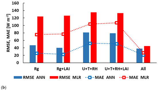 Following this analysis, ANN and MLR models were derived using several combinations of the input variables. We investigated two types of models: based on Rg alone and based on the other three variables, T, RH, and U. For each set of input variables, models were derived with and without LAI. Analysis was done on the entire data set of 2017. Values of R2, RMSE and MAE are presented in Figure 6a,b.