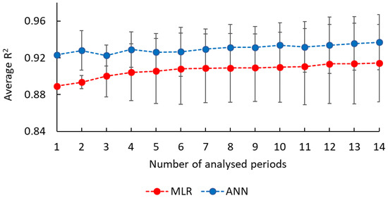 In each of the analyses, the whole measurement period of 2017 was divided into equal-duration sub-periods. Results of this analysis are presented in Figure 7. The results for both ANN and MLR models show that as the analysis period became shorter (the number of analysed periods increased), R2 slightly increased. We note that the increase was more pronounced when the change in period duration was more prominent (i.e., when the number of analysed periods in Figure 7 was small).