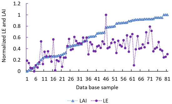 Seasonal time course of normalized LAI and LE at data points during the 2017 season (the X-axis) when all other meteorological variables were the same (within a narrow range). Values were normalized relative to their maximum during the season.