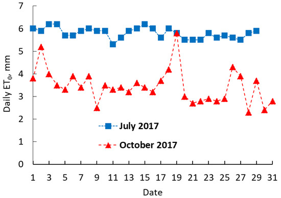 A possible reason for this difference is that at the experimental site, weather conditions are much more variable during October than during July, which provided a training dataset for a more reliable model. To illustrate this difference, we analysed the reference evapotranspiration, ET0, from a nearby meteorological station operated by the IMS—Israel Meteorological Service—during October and July 2017. We chose ET0 for this comparison because it represents an integrated measure of weather conditions. The results of this analysis are presented in Figure 9. The results show a much larger variability of weather conditions in October than in July, which supports the improved performance of the model when trained using October rather than July data.