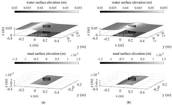 Snapshots of the water surface displacement and the mud surface displacement are shown in Figure 10 from s to s. In Figure 10a at s, the wave crest approaches the cylinder. Both the water surface and the mud surface rise upstream of the cylinder. In Figure 10b at s, the wave crest reaches the lateral axis of the cylinder ( m). Water surface upstream of the cylinder and on the lateral sides of the cylinder rises. The mud surface rises on the lateral sides of the cylinder. However, depressions occur on the mud surface upstream of the cylinder. In Figure 10c at s, the wave is just downstream of the cylinder. Wave runup on the cylinder can be observed on the downstream side. Due to wave scattering, an area of water surface depressions shows on the upstream and lateral sides of the cylinder. The mud surface also shows a depression upstream of the cylinder. However, differently from the water surface, on the lateral sides, the mud surface rises; a slight mud surface depression also shows immediately downstream of the cylinder. In Figure 10d at s, the wave has just left the cylinder. The water surface depression due to wave scattering continues radiating outwards from the cylinder. The mud surface depression upstream of the cylinder remains, the mud surface elevation on the lateral sides of the cylinder rises near to a maximum, and the mud surface depression downstream of the cylinder also grows near to a maximum extent.