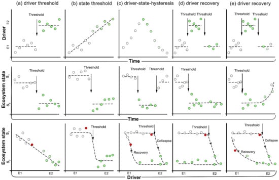 - Scheffer, M.; Carpenter, S.R. Catastrophic regime shifts in ecosystems: Linking theory to observation. Trends Ecol. Evol. 2003, 18, 648–656. [Google Scholar] [CrossRef]