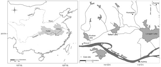 - Yang, X.; Shen, J.; Dong, X.; Liu, E.; Wang, S. Historical trophic evolutions and their ecological responses from shallow lakes in the middle and lower reaches of the Yangtze River: Case studies on Longgan Lake and Taibai Lake. Sci. China Ser. D Earth Sci. 2006, 49, 51–61. [Google Scholar] [CrossRef]