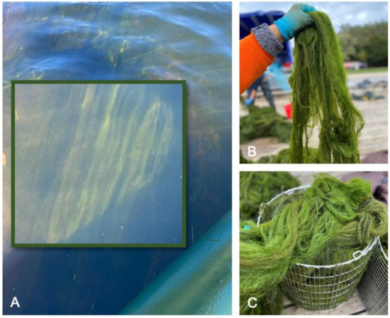 (A) Agglomerations of macroalgal C. glomerata biomass in River Šventoji; (B) Collected C. glomerata biomass; (C) Washed and cleaned biomass of macroalgae.