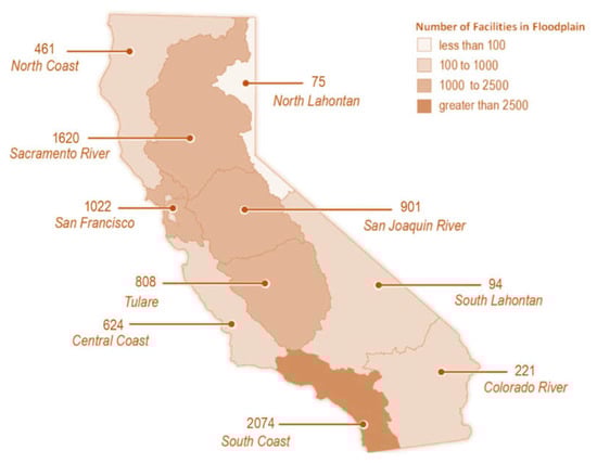 Transportation facilities within the floodplains by California hydrologic regions. Transportation facilities include highways, railroads, public transportation facilities, airports, etc. data from [27].