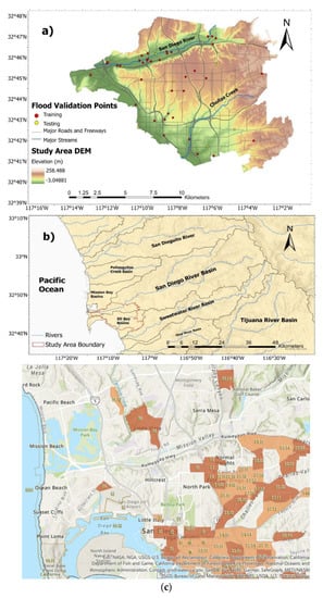 Figure 1 provides broader geographic and infrastructure context for the study area within the San Diego region, and this is shown in detail in Figure 2. The study area was chosen based on the following parameters: an area entirely within the extent of satellite images taken during times of flooding, an area with the necessary hydrologic data to create a flood risk model, and an area containing enough validation points for statistical significance. The San Diego Bay Basin meets these criteria. The region is entirely within the city of San Diego, covering about 155 mi2, and includes the flood-vulnerable Mission Valley area as well as disadvantaged neighborhoods such as City Heights and Barrio Logan, as shown in Figure 2C. The study area is the same for both the flood risk mapping and image classification portions of the study. The climate in the city is semi-arid Mediterranean, with long dry seasons and short wet seasons during the winter months. The climate, measured near the downtown in the south-western corner of the study area, is generally warm and mild, with maximum average monthly temperatures around 25 °C in August and September and average monthly lows in December and January of 14 °C. Precipitation is highly seasonal on both the coast and in the more humid highlands. The average precipitation in the city itself is 9.79 inches a year, with approximately three-quarters of this value falling between December and March.