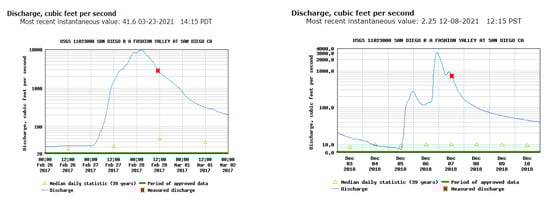 - USGS. USGS Streamflow Measuring Station. 11023000 San Diego R a Fashion Valley at San Diego, CA. Available online: https://waterdata.usgs.gov/ca/nwis/uv/?site_no=11023000&PARAmeter_cd=00065,00060 (accessed on 7 December 2021).